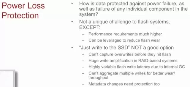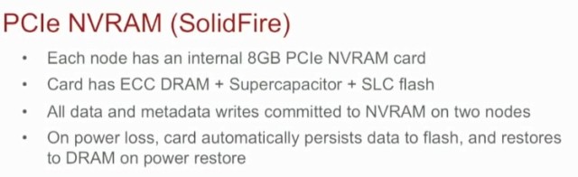 SF采用PCIe NVRAM的方式,每一個(gè)節(jié)點(diǎn)都內(nèi)置一個(gè)8G NVRAM卡,上面有超級(jí)電容和SLC閃存,所有的數(shù)據(jù)和元數(shù)據(jù)都同時(shí)提交給2個(gè)節(jié)點(diǎn),掉電時(shí),卡把數(shù)據(jù)刷到閃存,來(lái)電的時(shí)候恢復(fù)到內(nèi)存里。(這個(gè)方法和華為FusionStorage的保護(hù)方式類(lèi)似)