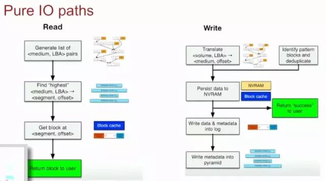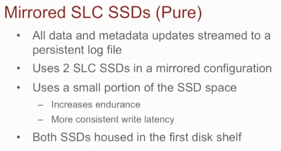 Pure采用鏡像SLC SSD的方式,所有的數(shù)據(jù)和元數(shù)據(jù)更新流化到一個(gè)持久的日志文件里,使用2個(gè)SLC SSD做鏡像,兩個(gè)SSD都放在第一個(gè)硬盤(pán)框里。這種方法使用小部分的SLC SSD空間,但可以增加壽命,提供更一致的寫(xiě)延遲。