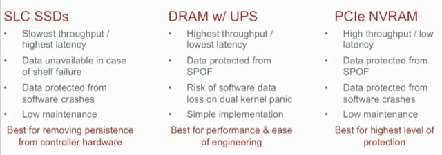 這三種方法的對(duì)比如下。SLC SSD的方式性能最差,PCIe NMRAM其次,DRAM w/UPS方式最快。SLC SSD方式磁盤(pán)框壞了數(shù)據(jù)就不可用了,而其他兩種則沒(méi)有SPOF。SLC SSD和PCIe NVRAM的方式都可以防止軟件崩潰,而DRAM w/UPS在雙kenel panic下有數(shù)據(jù)丟失的風(fēng)險(xiǎn),維護(hù)性也差一些。SLC SSD的方法適合從控制器去除持久數(shù)據(jù)的場(chǎng)景(這個(gè)就是為啥Pure支持NDU的一個(gè)原因,因?yàn)槭褂昧藷o(wú)狀態(tài)控制器),而DRAM w/UPS的方式實(shí)現(xiàn)簡(jiǎn)單,性能好,但PCIe NVRAM方式提供最高級(jí)別的保護(hù)。