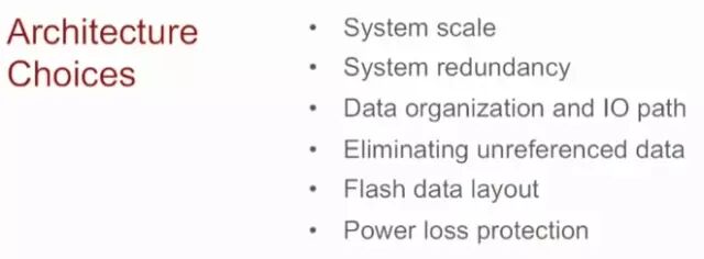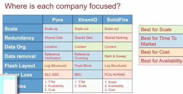最后匯總了三個(gè)閃存產(chǎn)品架構(gòu)在這6方面的實(shí)現(xiàn)方法,有些方法擴(kuò)展性好,有些方法實(shí)現(xiàn)簡(jiǎn)單,有些方法成本最優(yōu),有些方法可靠性最高。圖中用不同的顏色做了標(biāo)記??偟膩?lái)說(shuō),Pure關(guān)注TTM,可用性和成本,而XtremIO關(guān)注TTM和擴(kuò)展性,SF關(guān)注擴(kuò)展性、可用性和成本。