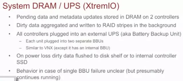 而XtremIO采用系統(tǒng)內(nèi)存加UPS的方法。待寫(xiě)的數(shù)據(jù)和元數(shù)據(jù)保存在2個(gè)控制器的內(nèi)存里,臟數(shù)據(jù)在后臺(tái)聚合成RAID條帶寫(xiě),和VNX類(lèi)似,所有的控制器需要外部UPS保護(hù),只不過(guò)VNX2現(xiàn)在用的是內(nèi)部的BBU。在掉電的時(shí)候,臟數(shù)據(jù)刷到磁盤(pán)框或者內(nèi)部控制器的SSD。如果單個(gè)BBU故障如何處理不明(可能會(huì)繼續(xù)保持運(yùn)行)。