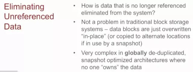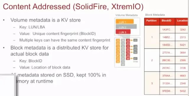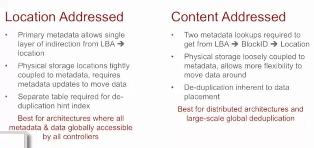 這是兩種尋址方式的對(duì)比。位置尋址只是單層映射,即LBA->位置,因此位置和元數(shù)據(jù)是緊耦合的關(guān)系,數(shù)據(jù)移動(dòng)需要更新元數(shù)據(jù),重刪實(shí)現(xiàn)需要附加的表格和索引。而內(nèi)容存儲(chǔ)方式采用兩層元數(shù)據(jù)映射LBA->塊ID->位置,物理位置和元數(shù)據(jù)是松耦合,靈活性更好,天然就支持重刪。位置尋址適合所有的控制器都可以全局訪問(wèn)元數(shù)據(jù)的架構(gòu),而內(nèi)容尋址適合大規(guī)模全局重刪和分布式架構(gòu)。