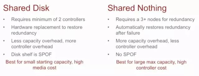 這兩種架構(gòu)的區(qū)別如下,共享硬盤(pán)架構(gòu)比較適合小容量起步的場(chǎng)合,硬盤(pán)成本高,而啥也不共享架構(gòu)比較適合大容量場(chǎng)景,控制器成本高。