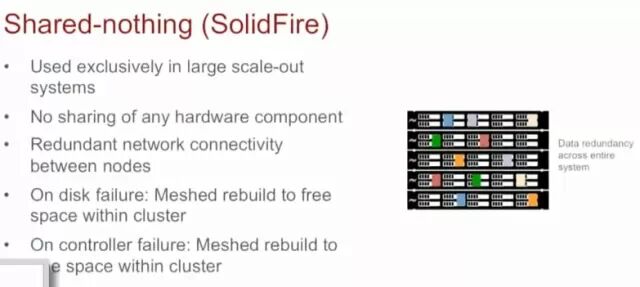 而SF采用的是啥也不共享的架構(gòu)。西瓜哥認(rèn)為,其實(shí)就是現(xiàn)在云(對(duì)象)存儲(chǔ),如華為的UDS常采用的架構(gòu)。這種架構(gòu)采用多副本技術(shù),好像SF是2副本,可以承受最少一個(gè)節(jié)點(diǎn)故障。但與會(huì)嘉賓提出了“質(zhì)疑”,說(shuō)軟件成為了SPOF,O(∩_∩)O哈!因此,軟件的健壯性很重要。