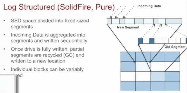 而SF和Pure采用的是日志結(jié)構(gòu)方式。SSD空間分成固定大小的段,進(jìn)入的數(shù)據(jù)匯聚成段并順序?qū)懭?,一旦硬盤(pán)寫(xiě)滿(mǎn),部分的段被垃圾收集,并寫(xiě)到新的位置,每個(gè)塊大小可以不同。