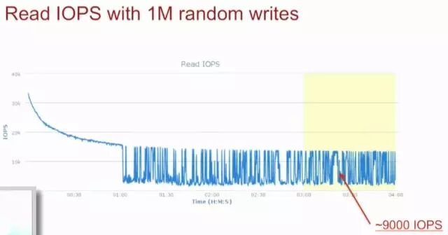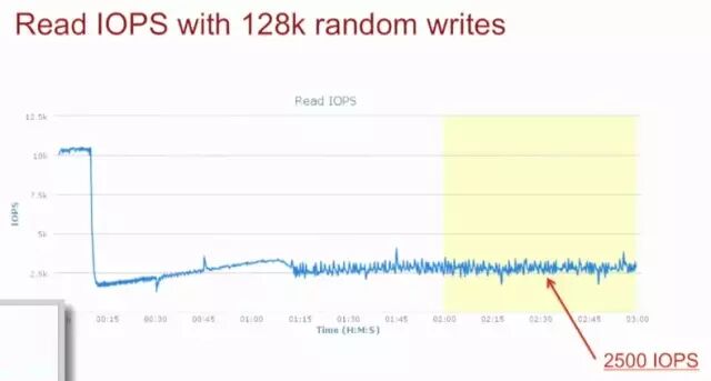 如果是普通的cMLC的硬盤(pán),由于其控制芯片處理能力差,超供也不高,因此,剛開(kāi)始性能還不錯(cuò),但開(kāi)始垃圾收集的時(shí)候,128K隨機(jī)讀性能馬上下降到2500 IOPS。