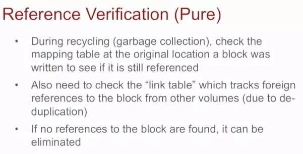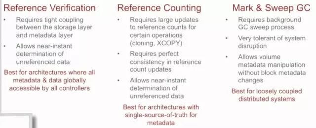 這個(gè)三種方法的區(qū)別如下,引用驗(yàn)證的方式需要存儲(chǔ)層和元數(shù)據(jù)層緊耦合,允許幾乎馬上就決定那個(gè)數(shù)據(jù)不在用,特別適合全局共享元數(shù)據(jù)場(chǎng)景;引用計(jì)數(shù)的方式在某些操作(克隆,XCOPY)需要大量更新計(jì)數(shù)器,計(jì)數(shù)要非常精確,不能有絲毫差錯(cuò),也可以幾乎立即決定哪些數(shù)據(jù)沒(méi)有用,非常適合單一信任源的元數(shù)據(jù)場(chǎng)景;而標(biāo)記&掃除 GC的方式,需要GC掃除在后臺(tái)運(yùn)行,系統(tǒng)的抗干擾性非常高,允許沒(méi)有改變塊元數(shù)據(jù)下對(duì)卷的元數(shù)據(jù)進(jìn)行處理,非常適合松耦合的分布系統(tǒng)。