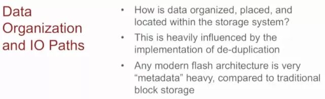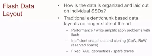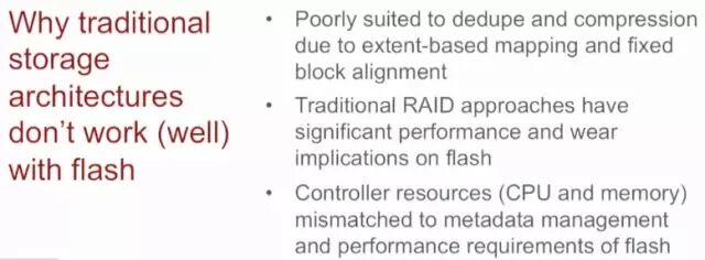 為什么傳統(tǒng)的架構(gòu)不適合閃存?一是基于extent映射和固定塊對(duì)齊的方式很難支持重刪和壓縮,二是傳統(tǒng)的RAID方式帶來(lái)閃存的性能和磨損問(wèn)題,三是控制器的資源和閃存的需要不匹配,因?yàn)殚W存需要更多的原數(shù)據(jù)的存儲(chǔ)和管理。