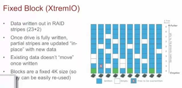 XtremIO采用的是固定塊的方式。數(shù)據(jù)以一個(gè)RAID條帶(23+2)條帶寫(xiě)入,一旦硬盤(pán)寫(xiě)滿(mǎn),部分條帶被新數(shù)據(jù)更新,一旦寫(xiě)入,數(shù)據(jù)不再“移動(dòng)”,數(shù)據(jù)塊固定為4K大?。ìF(xiàn)在XIOS 3.0已經(jīng)改為8K,因此需要破壞升級(jí),如昨天我們討論的那樣)。