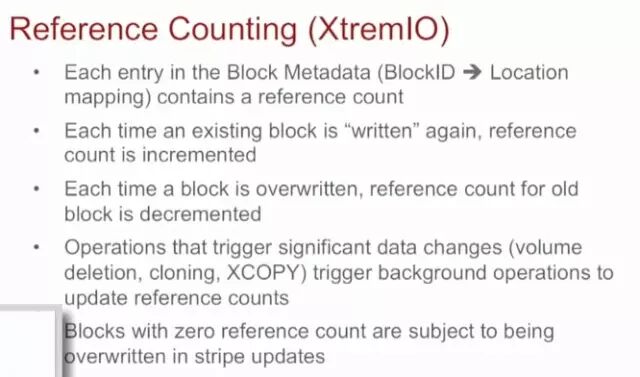 而XtremIO采取的是引用計(jì)數(shù)的方式。原理其實(shí)很簡(jiǎn)單,塊的元數(shù)據(jù)(塊ID->位置映射)包含一個(gè)引用計(jì)數(shù),“寫(xiě)”一次計(jì)數(shù)就加一,重寫(xiě)時(shí)舊的塊(其實(shí)就是刪除)就減一。大家注意這個(gè)寫(xiě)打引號(hào)了,不是真正去寫(xiě)物理位置。如果是一個(gè)卷的刪除、克隆和XCOPY操作,由于需要大量修改引用計(jì)數(shù),因此會(huì)觸發(fā)后臺(tái)進(jìn)程去做這件事情。當(dāng)引用為零,說(shuō)明沒(méi)人用這個(gè)塊了,就可以被條帶更新時(shí)覆蓋寫(xiě)了。(XtremIO不做系統(tǒng)級(jí)的垃圾收集,下面我們討論這個(gè)問(wèn)題)