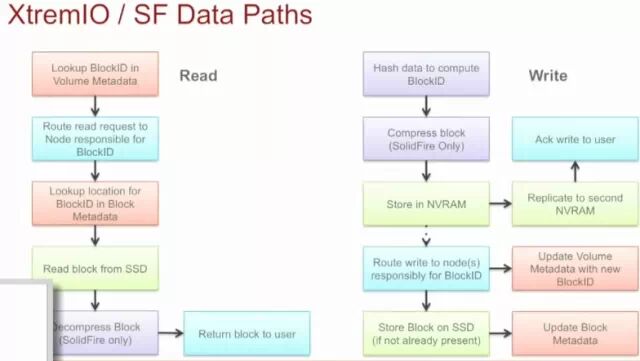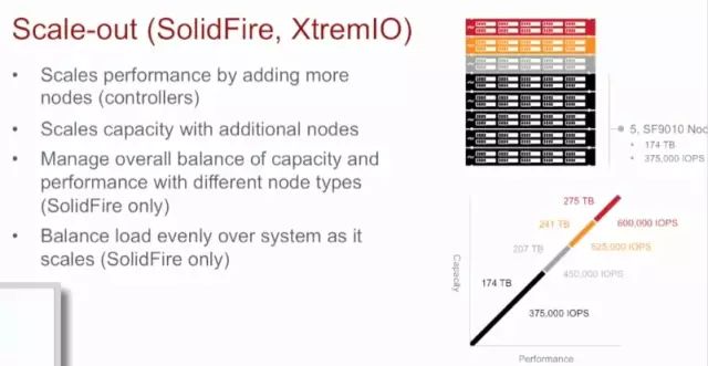 而SF和XtremIO都采用橫向擴(kuò)展的架構(gòu)。性能和容量都可以線性增長(zhǎng)。目前SF集群的節(jié)點(diǎn)可以是不同類(lèi)型,而且性能可以動(dòng)態(tài)均衡。