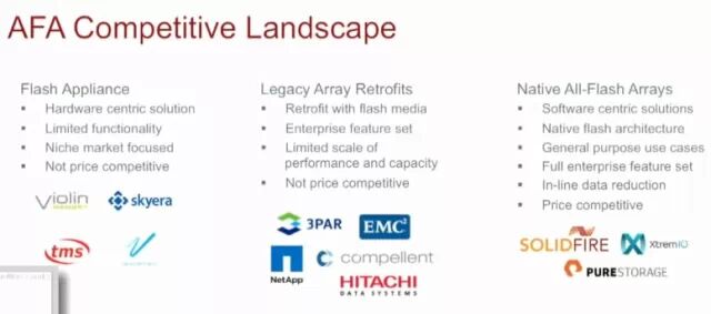 這是AFA的競(jìng)爭(zhēng)全景圖,我們看到大帥哥把IBM的TMS放在Flash Applicance分類(lèi)里面了,因?yàn)樗且杂布橹行牡脑O(shè)計(jì)方式。3PAR是傳統(tǒng)陣列的改良,而本質(zhì)上專(zhuān)為全閃存系統(tǒng)全新設(shè)計(jì)的是Pure Storage(后面簡(jiǎn)稱(chēng)Pure)、XtremIO和SolidFire(后面簡(jiǎn)稱(chēng)SF)。這些產(chǎn)品的特點(diǎn)是采用商用硬件,以軟件為中心,提供豐富的數(shù)據(jù)服務(wù),支持在線的數(shù)據(jù)縮減功能。