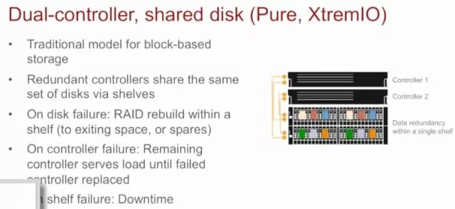 Pure和XtremIO都是采用雙控共享硬盤(pán)的架構(gòu),和傳統(tǒng)的塊存儲(chǔ)架構(gòu)一樣。如果硬盤(pán)失效,在該硬盤(pán)框內(nèi)重構(gòu),控制器失效,另外一個(gè)控制器接管。如果硬盤(pán)框壞了,系統(tǒng)就不能運(yùn)行了,也就是磁盤(pán)框是SPOF(單點(diǎn)失效)。