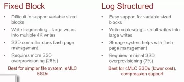 因此,固定塊方法很難支持變長(zhǎng)的塊,大塊的寫(xiě)會(huì)分成多個(gè)4k(或8K)的寫(xiě),SSD控制器來(lái)做閃存的page管理,需要更多的SSD超供(28%),這種架構(gòu)適合比較簡(jiǎn)單的文件系統(tǒng),采用eMLC SSD的場(chǎng)景。而日志結(jié)構(gòu)的方法,很容易支持變長(zhǎng)的塊,寫(xiě)可以聯(lián)合,即多個(gè)小的寫(xiě)聚合成一個(gè)大塊的寫(xiě),存儲(chǔ)系統(tǒng)幫助閃存做page管理,SSD的超供只需要7%,特別適合采用cMLC SSD,支持壓縮的場(chǎng)景。(不過(guò),現(xiàn)在XtremIO XIOS 3.0也支持壓縮了)。
