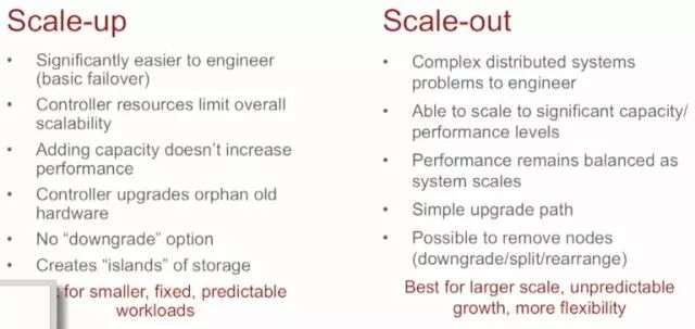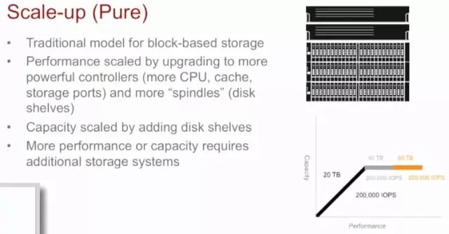 Pure采用的是縱向擴(kuò)展的方式,和傳統(tǒng)的塊存儲(chǔ)架構(gòu)一樣。需要更多性能,你只能升級(jí)到更強(qiáng)大的控制器,容量可以通過(guò)磁盤(pán)框來(lái)擴(kuò)展,但性能受限于兩個(gè)控制器的能力。