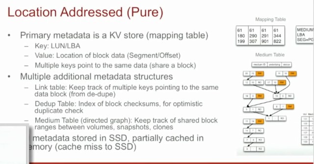 Pure采用位置尋址技術(shù)。主要的元數(shù)據(jù)是一個(gè)KV倉(cāng)庫(kù)(映射表)。另外,需要多個(gè)附加的元數(shù)據(jù)結(jié)構(gòu),包括鏈接表,重刪表和中間表(定向圖)。所有的元數(shù)據(jù)都保存在SSD里,采用內(nèi)存做Cache。