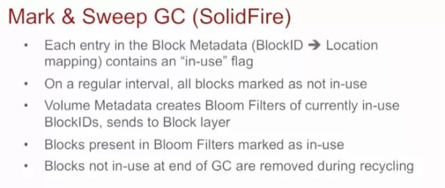 SF采用的方法是標(biāo)記&掃除GC的方式。塊的元數(shù)據(jù)的每個(gè)入口都包含一個(gè)“在用”的標(biāo)志,每隔一定的時(shí)間,所有的塊都標(biāo)記為未使用。卷的元數(shù)據(jù)創(chuàng)建當(dāng)前使用的塊ID的Bloom Filters(布隆濾波器,一種高效的數(shù)據(jù)結(jié)構(gòu),西瓜哥的數(shù)學(xué)是語(yǔ)文老師教的,大家可以百度學(xué)習(xí)),送到塊層,在布隆濾波器里面的塊就標(biāo)志為“在用”,在GC結(jié)束后沒(méi)有在用的塊就刪除了。這樣周而復(fù)始。(西瓜哥認(rèn)為這個(gè)設(shè)計(jì)的關(guān)鍵是找了一個(gè)高效的布隆濾波器,其特點(diǎn)是高效但可能有非常小的誤判,但誤判只是浪費(fèi)一點(diǎn)點(diǎn)空間而已,即有些塊沒(méi)有用而標(biāo)記為使用了。但這個(gè)誤判不影響數(shù)據(jù)的安全,但效率大大提高)。