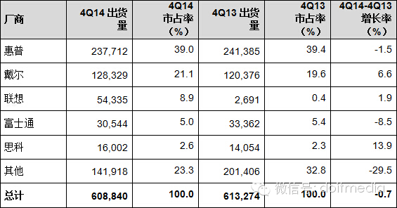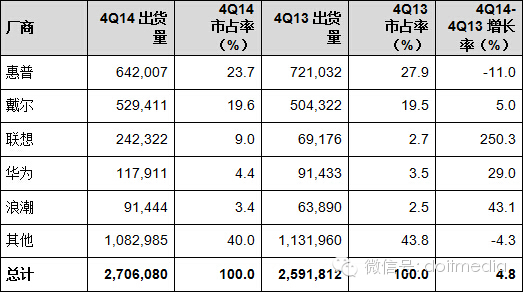 2014年第四季度全球服務(wù)器廠商出貨量初步統(tǒng)計(jì) (單位:臺(tái))