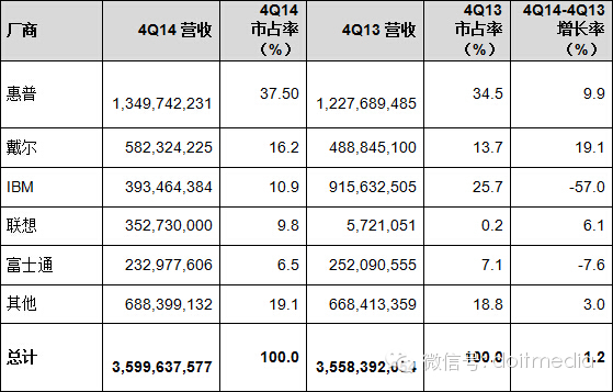 根據(jù)Gartner提供的2014年第四季度全球服務(wù)器廠商營(yíng)收初步統(tǒng)計(jì)表,2014年第四季度全球服務(wù)器市場(chǎng)營(yíng)收,最高是惠普始終不變,但年增長(zhǎng)率僅為1.5%不太樂(lè)觀,全球市場(chǎng)占有率27.9%;最引人注目的莫過(guò)于增長(zhǎng)幅度最大的聯(lián)想為743.4%,2014 Q4市場(chǎng)占有率由2013年的1.0%增加到7.9%,主要原因肯定是第四季度聯(lián)想完成了并購(gòu)IBM旗下x86服務(wù)器業(yè)務(wù),也因此IBM營(yíng)收出現(xiàn)50.6%的下滑。