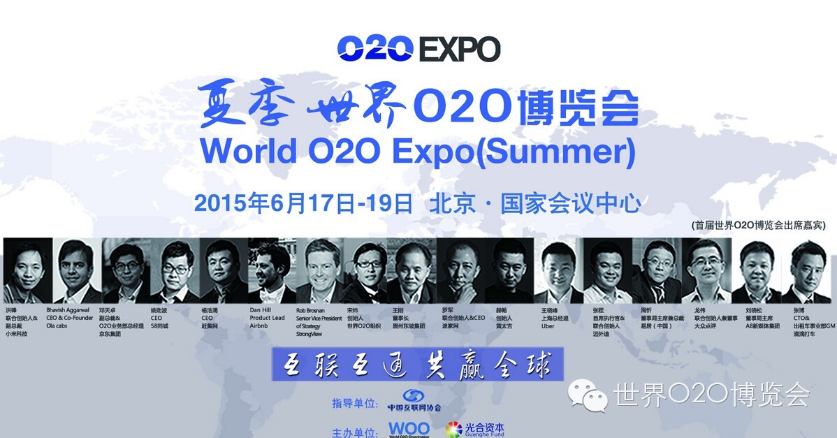 2015年1月17日,由中國互聯(lián)網協(xié)會指導,世界O2O組織(WOO)、光合資本主辦,以及新華網支持的《首屆世界O2O博覽會》在北京國家會議中心(APEC會場)隆重舉行,論壇力邀了airbnb、Zappos、Yelp、Uber、Ola Cabs、滴滴、大眾點評、美團、58等全球知名企業(yè)創(chuàng)始人或CEO出席。