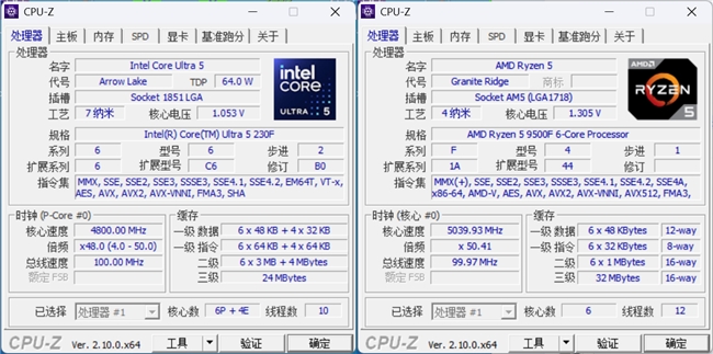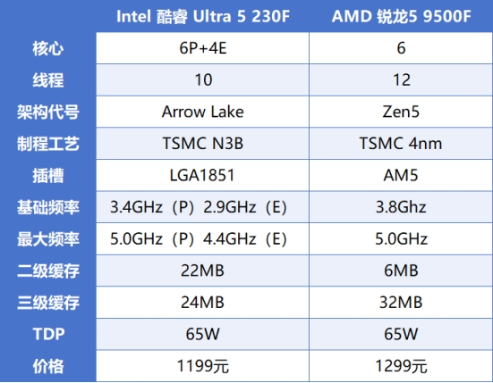 AMD銳龍5 9500F則是采用Zen 5架構(gòu),擁有6核12線程,基礎(chǔ)頻率為 3.8 GHz,最大加速頻率 5.0 GHz,L3緩存32MB。綜合來看,Ultra 5 230F的核心更多,制程工藝更先進(jìn),整體的架構(gòu)上的異構(gòu)設(shè)計也是Intel這邊更利于散熱更具有能效比,兩者最大頻率相同,基礎(chǔ)頻率是9500F要高一些。目前價格也是Ultra 5 230F要更便宜一些,畢竟一個是新出的,一個是半年前的,當(dāng)然了解AMD處理器的玩家也太會沖首發(fā)購買,價格是一定會跳水的。