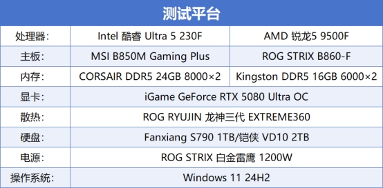 我們搭建了如下配置的兩套測試平臺,考慮到處理器的定位,兩套主機(jī)都是使用了B系列的主板,Intel這邊是微星的B850M,AMD這邊是ROG B860-F都是新一代的主板。為了避免顯卡瓶頸,顯卡使用了RTX 5080。內(nèi)存方面,Intel組使用了兩條24GB 8000頻率的DDR5內(nèi)存,AMD則是兩條DDR5 16GB 6000的。230F原生支持6400MT/s并且支持CUDIMM內(nèi)存,開啟XMP后可輕松來到8000+MT/s,后續(xù)我們也會測試6000MT/s和8000MT/s的內(nèi)存對網(wǎng)游的影響。而AMD這里內(nèi)存支持僅為5600MT/s,在高頻內(nèi)存的兼容性以及性能表現(xiàn)上是不及Intel的。