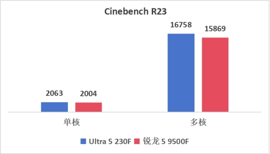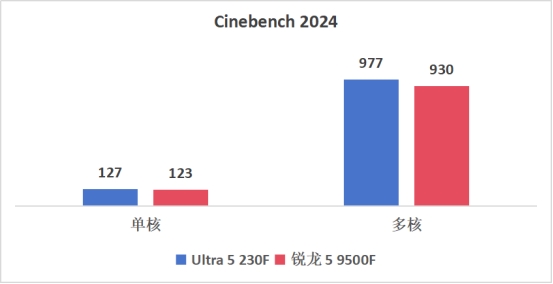 接下來我們來看幾項理論測試以及生產(chǎn)力測試,在Cinebench R23測試中,單核性能上230F領(lǐng)先9500F 2.9%,多核性能上領(lǐng)先5.6%。Cinebench 2024中也有類似表現(xiàn),單核性能230F領(lǐng)先3.2%,多核領(lǐng)先5%。在3DMark CPU Profile中,差距還要明顯,單線程領(lǐng)先2.4%。最大線程領(lǐng)先28%。