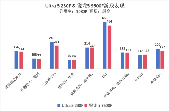 接下來是游戲測試,統(tǒng)一在1080P分辨率,最高畫質(zhì)下進(jìn)行,有基準(zhǔn)測試的游戲都會運行基準(zhǔn)測試,無基準(zhǔn)測試的則會在固定地圖中進(jìn)行固定路線跑圖。在測試的9款游戲中,230F7勝1平1負(fù)。《極限競速:地平線5》上兩款處理器幀數(shù)表現(xiàn)相同,《DOTA2》中落后4%。在剩下來的七款游戲中,《賽博朋克2077》和《使命召喚:黑色行動6》中領(lǐng)先幅度在1%左右。其中非?;馃岬摹度侵扌袆印奉I(lǐng)先幅度最大高達(dá)16%。整體上230F領(lǐng)先9500F 4.7%左右