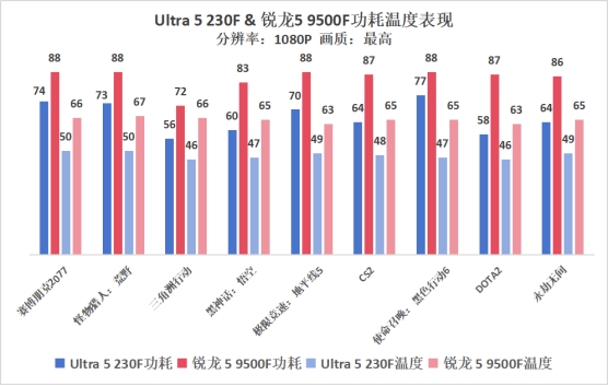 在游戲測試中我們還額外記錄了其功耗和溫度表現(xiàn),Arrow Lake架構(gòu)最顯著的提升就是其能效比,在保證游戲性能不變的情況下降低40%功耗,游戲平均功耗約為66W。9500F雖然有88W功耗墻但是其架構(gòu)原因?qū)е碌姆e熱問題還是存在的。溫度也基本在65度上下,比230F高了15度還多。