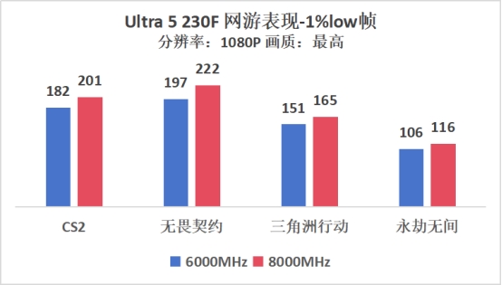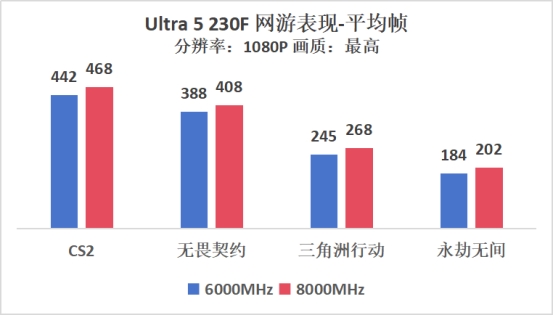 最后我們來對比一下6000MH內(nèi)存與8000MHz內(nèi)存在網(wǎng)游上的差異。內(nèi)存的頻率其實也是影響CPU性能發(fā)揮的一個重要因素,低延遲+更高的信息交互速度也能為游戲帶來提升。平均幀上,8000MHz會有7%的漲幅,1%low幀則更加明顯會來到10%。如今市面上的絕大多數(shù)內(nèi)存都會支持Intel的XMP技術(shù),簡單來說就是提供了一套預(yù)設(shè)的超頻配置文件可以讓內(nèi)存自動超頻至其最佳狀態(tài)。