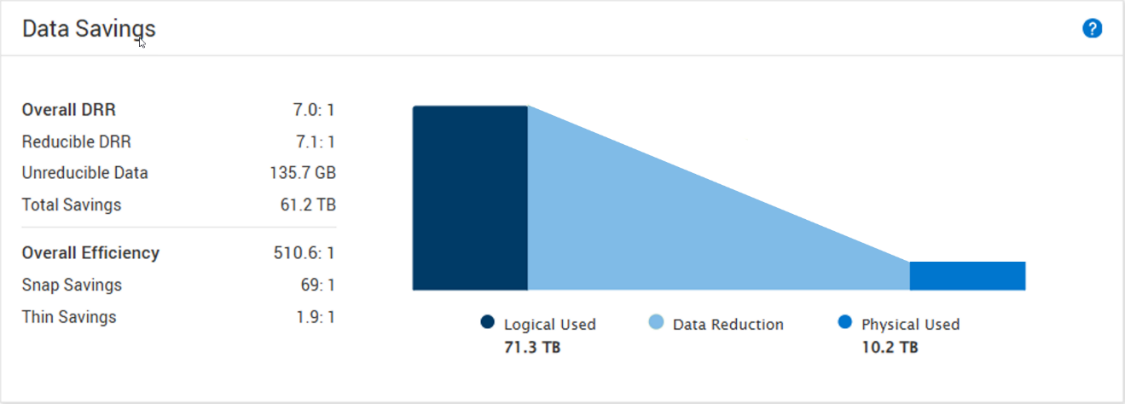 在此前的 PowerStoreOS 4.0 中,系統(tǒng)已支持在集群和設備層面顯示數(shù)據(jù)縮減節(jié)省信息,幫助用戶直觀了解數(shù)據(jù)占用空間及縮減比情況。而在最新的 PowerStoreOS 4.2 中,PowerStore Manager 的數(shù)據(jù)節(jié)省報告功能不僅在前述兩個層面實現(xiàn)持續(xù)優(yōu)化,更新增表格視圖以更清晰直觀地展示數(shù)據(jù)使用情況,為用戶提供更便捷的分析體驗。