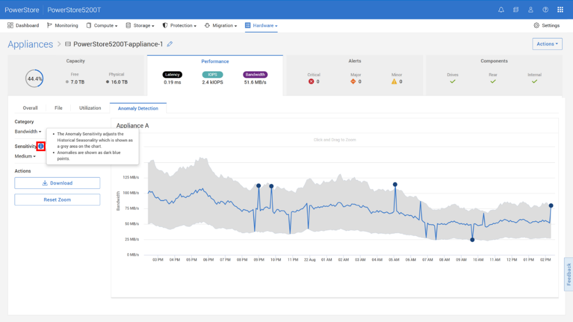 此外,PowerStore 的異常檢測 (Anomaly Detection) 功能也得到強化,可為用戶提供設備運行的可視化監(jiān)控與異常報告,并基于歷史行為自動標記異常點,幫助快速識別性能異常,及時采取優(yōu)化措施,確保系統(tǒng)始終保持穩(wěn)定高效的運行狀態(tài);用戶還可根據(jù)實際需求調(diào)整檢測靈敏度,實現(xiàn)更精細的性能監(jiān)控與分析。該功能現(xiàn)已覆蓋帶寬、總體及讀寫 IOPS、延遲與 I/O 大小等關鍵性能指標。
